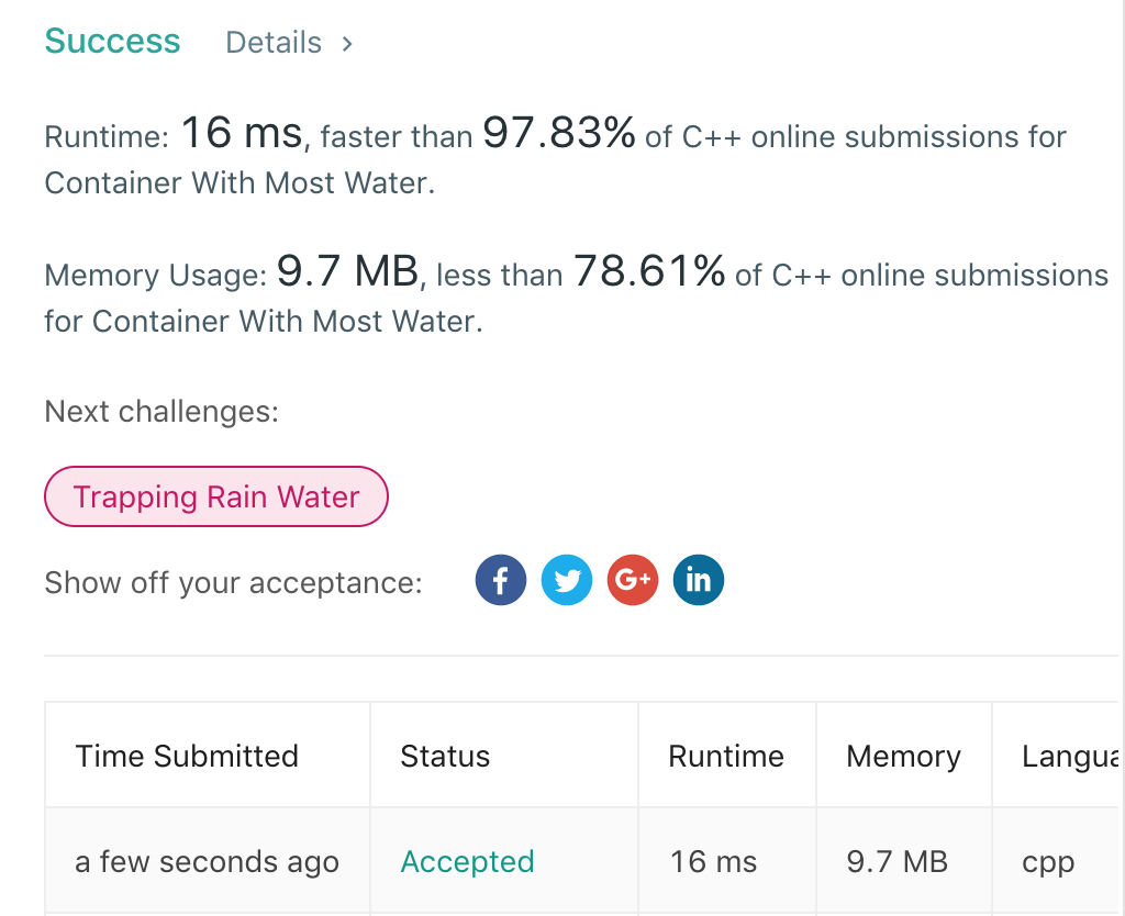 乘水的面积是由(两端较小的高度)×(两个板之间的宽度)决定的。最大盛水量取决于两边中较短的那条边,而且如果将较短的边换为更短边的话,盛水量只会变少。所以我们可以用两个头尾指针left和right,计算出当前最大的盛水量后,将较短的边向中间移,因为我们想看看能不能把较短的边换长一点。这样一直计算到左边指针left大于右边指针right为止就行了。