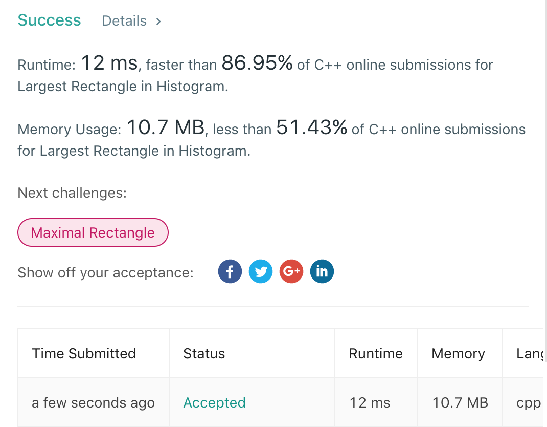 for(int i=0; i < len; i++) { while(!st.empty() && heights[i] < heights[st.top()])//当前遍历的元素小于栈顶元素,出现右边界 { int val = st.top(); st.pop(); ans = max(ans, heights[val]*(i-1-(st.empty()?-1:st.top())));//当前元素为右边界,val为当前处理的bar,st.top()为左边界,计算矩形面积 } st.push(i); } return ans; } }; [/cc] 运行结果: