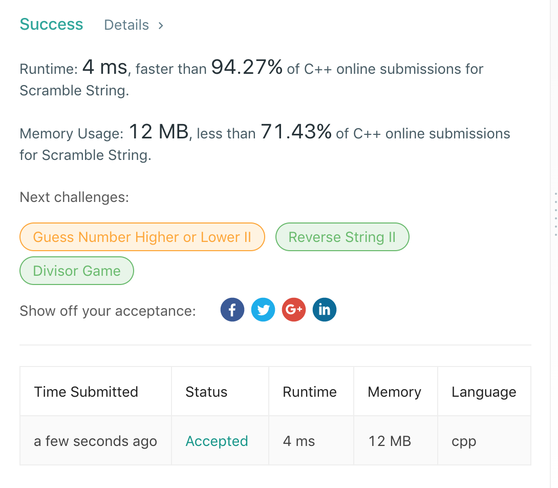 for(int i=1; i < s1.size(); i++) { string s11 = s1.substr(0,i);//当前长度i将s1分为两部分 string s12 = s1.substr(i); string s21 = s2.substr(0,i);//根据当前长度i将s2分为两部分 string s22 = s2.substr(i); if(isScramble(s11,s21) && isScramble(s12, s22)) return true; s21 = s2.substr(s2.size()-i);//长度从后切分 s22 = s2.substr(0, s2.size()-i); if(isScramble(s11,s21) && isScramble(s12, s22)) return true; } return false; } }; [/cc] 运行结果:
