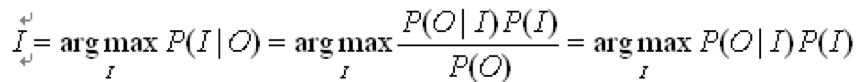 已知道输出为O,求解它的最大可能输入I,即在O下条件概率最大的那个I,通过贝叶斯公式转换就可以得到: