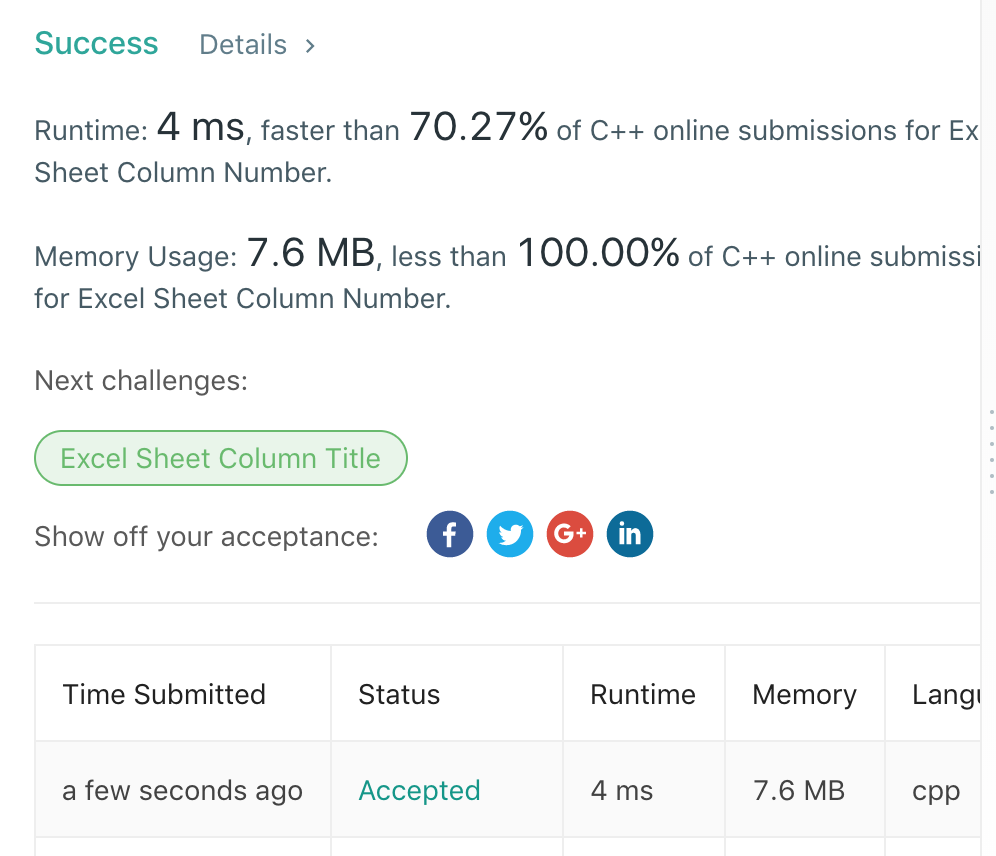解析:根据Excel的列名称,获取对应的数值,可以认为是一个26进制的数值转为10进制,此题关键在于字母与对应数字的转换,转化处理如下:(s.at(i)-‘A’+1)。具体代码如下: